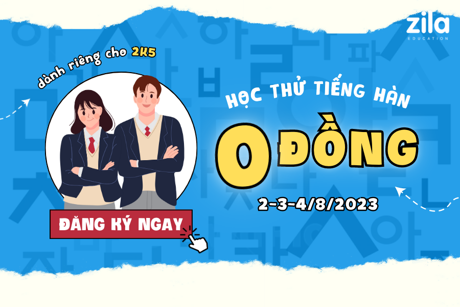 07/07/2023Lớp học thử tiếng Hàn 0 đồng là chương trình dạy tiếng Hàn miễn phí được Zila thực hiện dành riêng cho các bạn học sinh có niềm đam mê với ngôn ngữ Hàn Quốc. Đồng thời là mong muốn đưa tiếng Hàn đến gần hơn với thế hệ trẻ Việt Nam. Lớp học thử tiếng Hàn sẽ bao gồm 3 buổi học với nội dung là nền tảng cơ bản nhất của ngôn ngữ Hàn Quốc. Việc tiếp xúc và học thêm một ngôn ngữ mới chắc chắn là một trải nghiệm mới mẻ cho mùa hè này nhỉ?