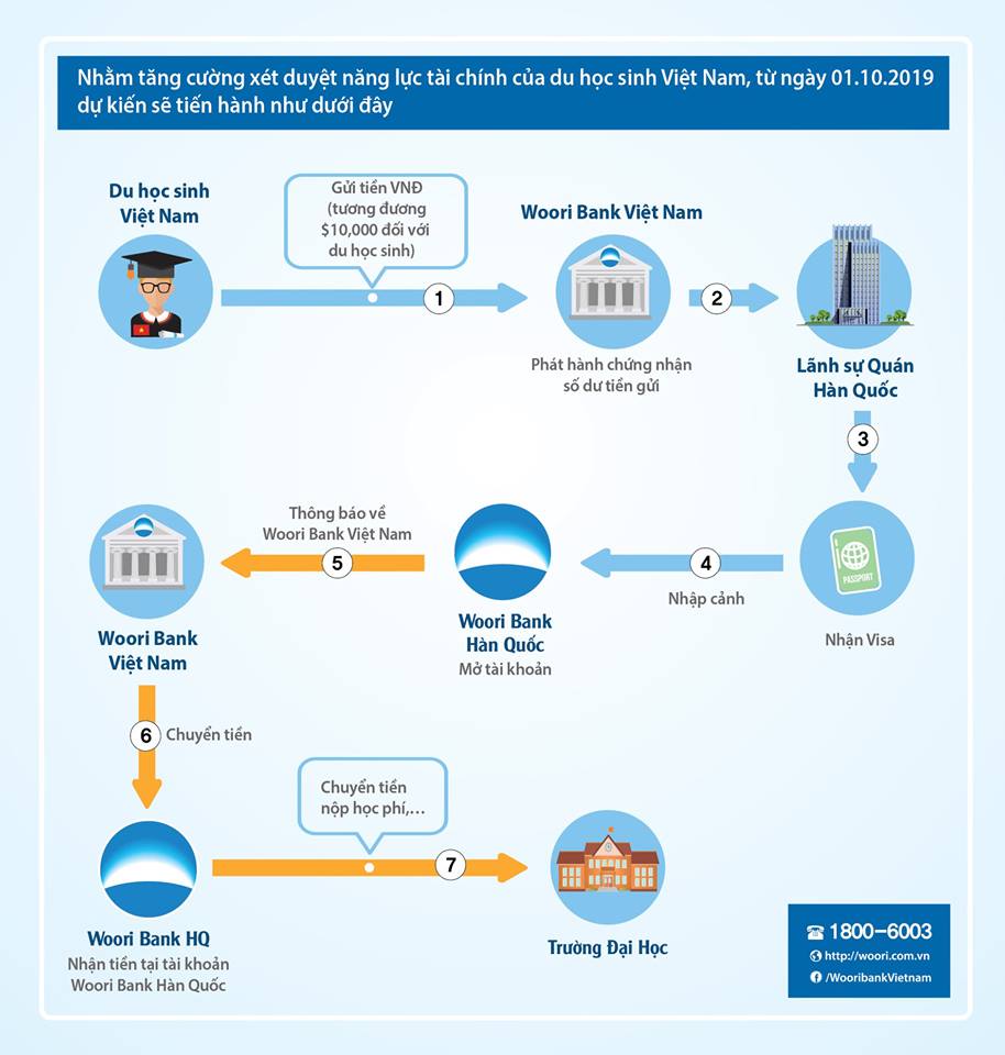 Chế độ bảo lãnh tài chính cho du học sinh học tiếng người Việt Nam yêu cầu học sinh phải gửi tiết kiệm $10.000 vào ngân hàng Hàn Quốc có trụ sở hoặc chi nhánh tại Việt Nam, và nộp giấy chứng nhận số dư cho trường Đại học Hàn Quốc để xin visa tại Hàn Quốc. Sau khi học sinh nhập cảnh sang Hàn Quốc, khoản tiền $10.000 đó sẽ được quy đổi sang tiền Won và chuyển sang tài khoản ngân hàng Woori của học sinh mở tại Hàn Quốc. Sau sáu tháng, học sinh sẽ được rút $5.000 và sáu tháng tiếp theo sẽ được rút $5.000 còn lại.