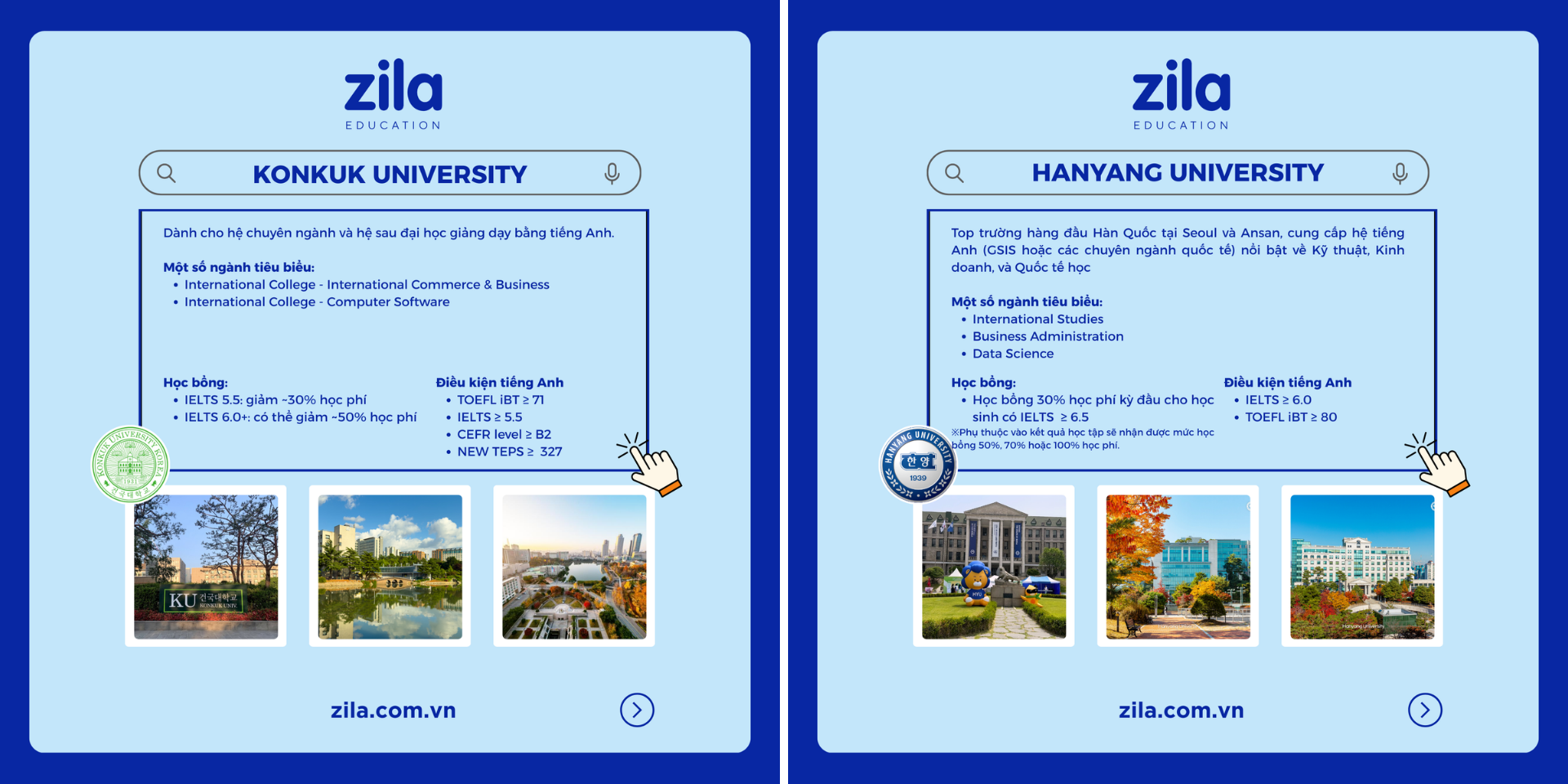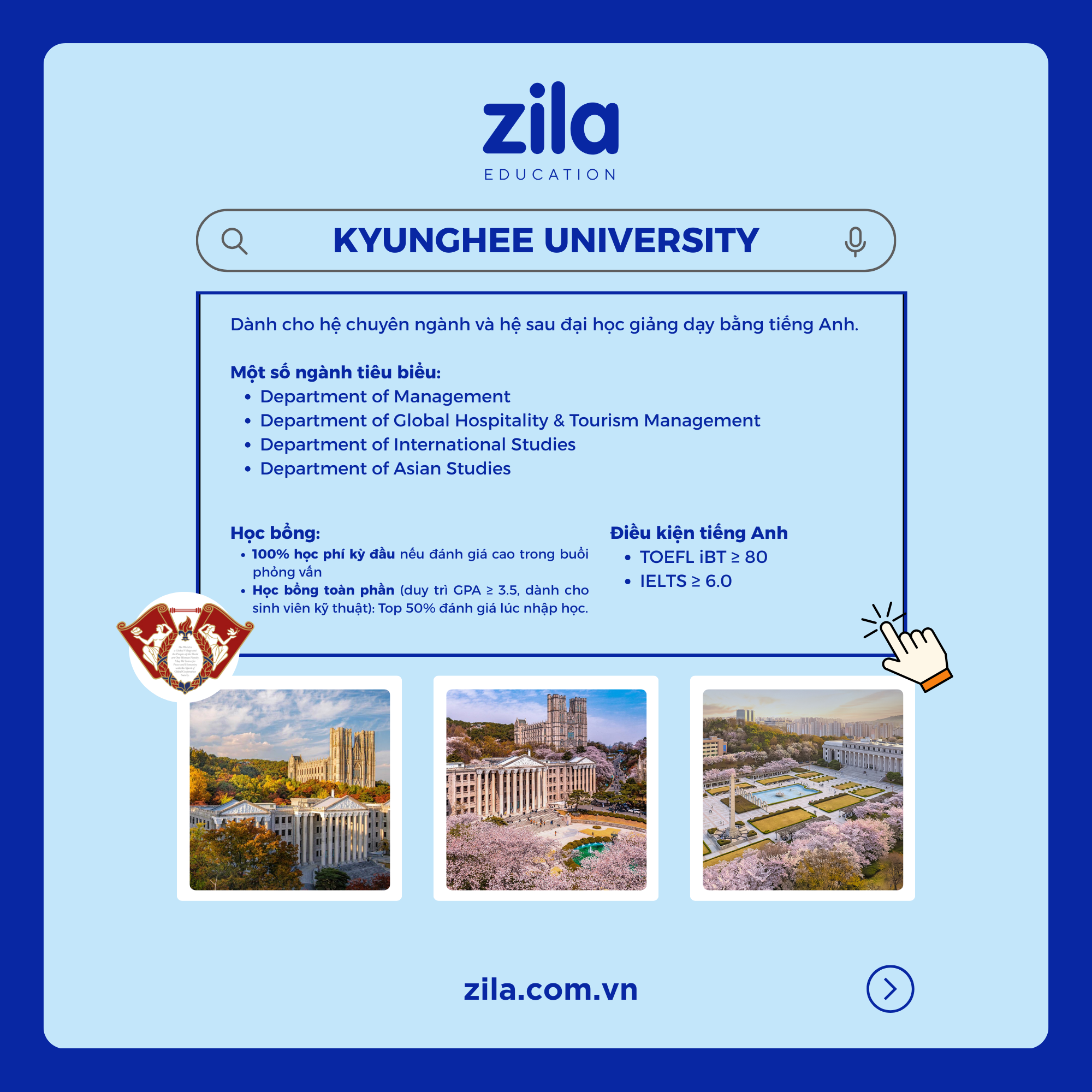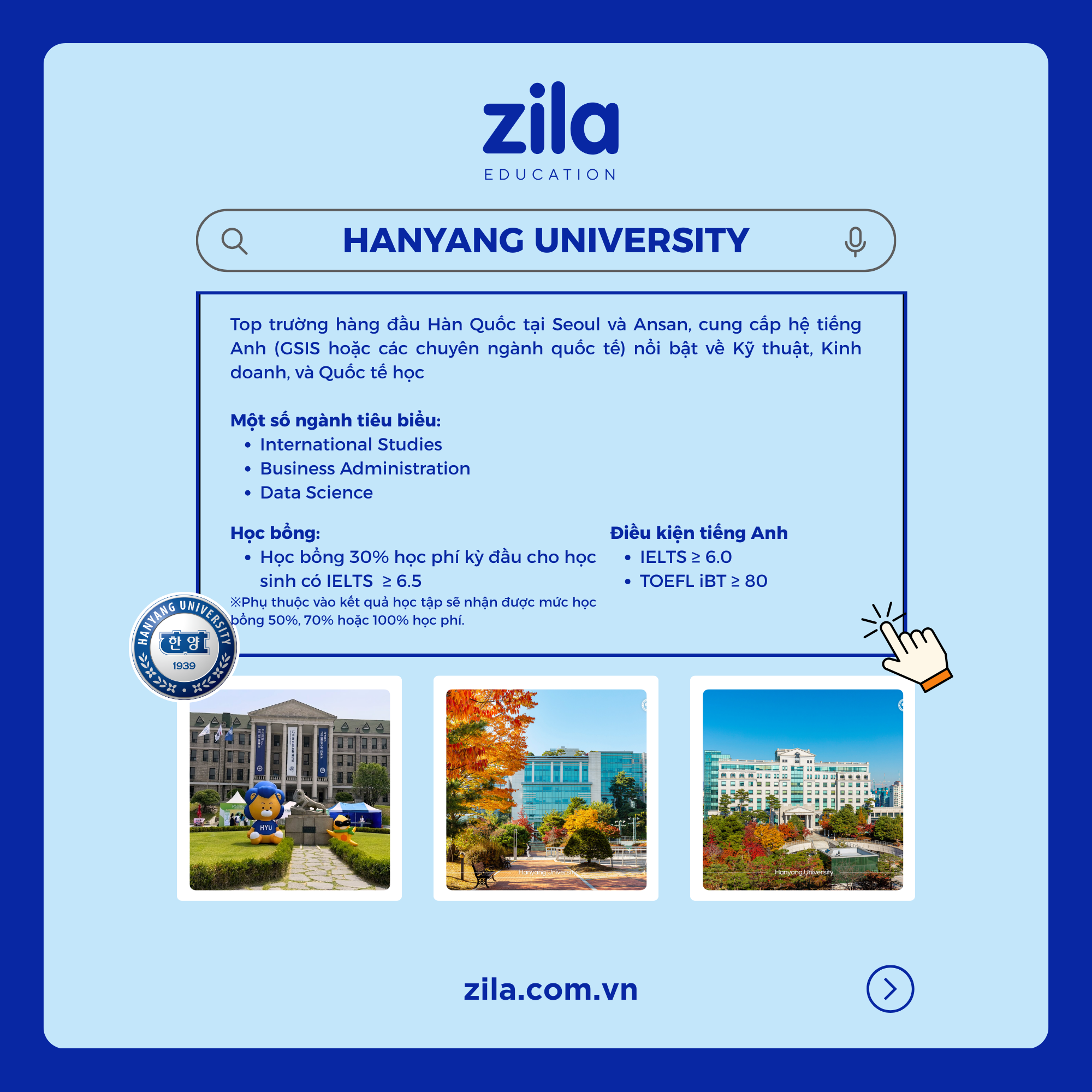 Với hơn 10 năm kinh nghiệm trong lĩnh vực du học Hàn Quốc, Zila sẽ tư vấn mọi thông tin cần thiết về du học Hàn Quốc hoàn toàn MIỄN PHÍ, giúp học sinh và gia đình lựa chọn được trường học và khu vực phù hợp để có được cái nhìn đầy đủ và chính xác nhất trước khi quyết định sang du học Hàn Quốc.