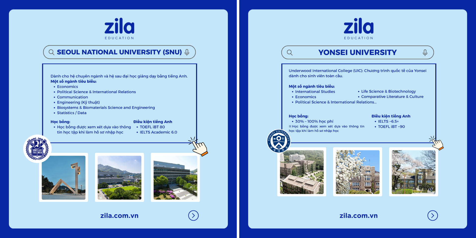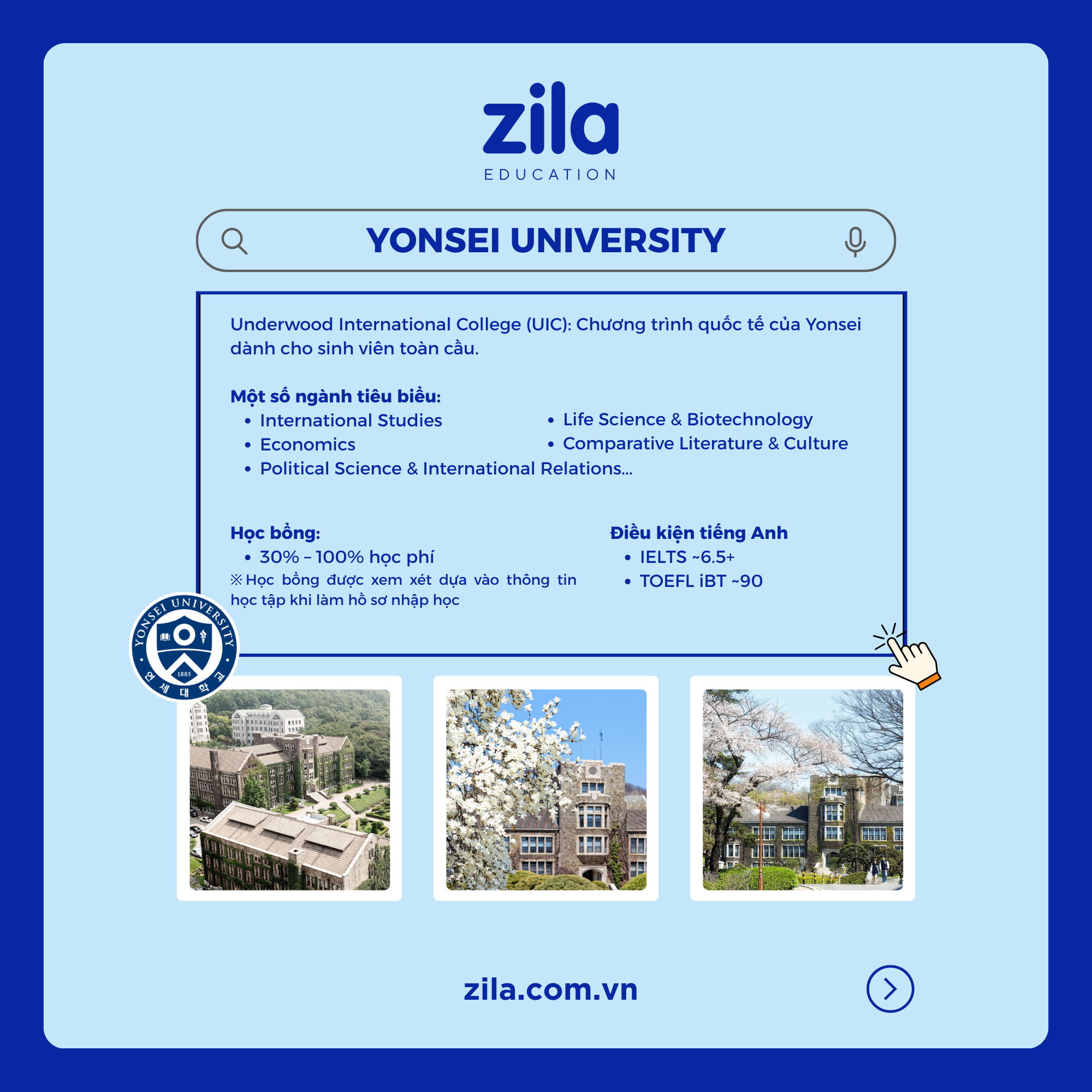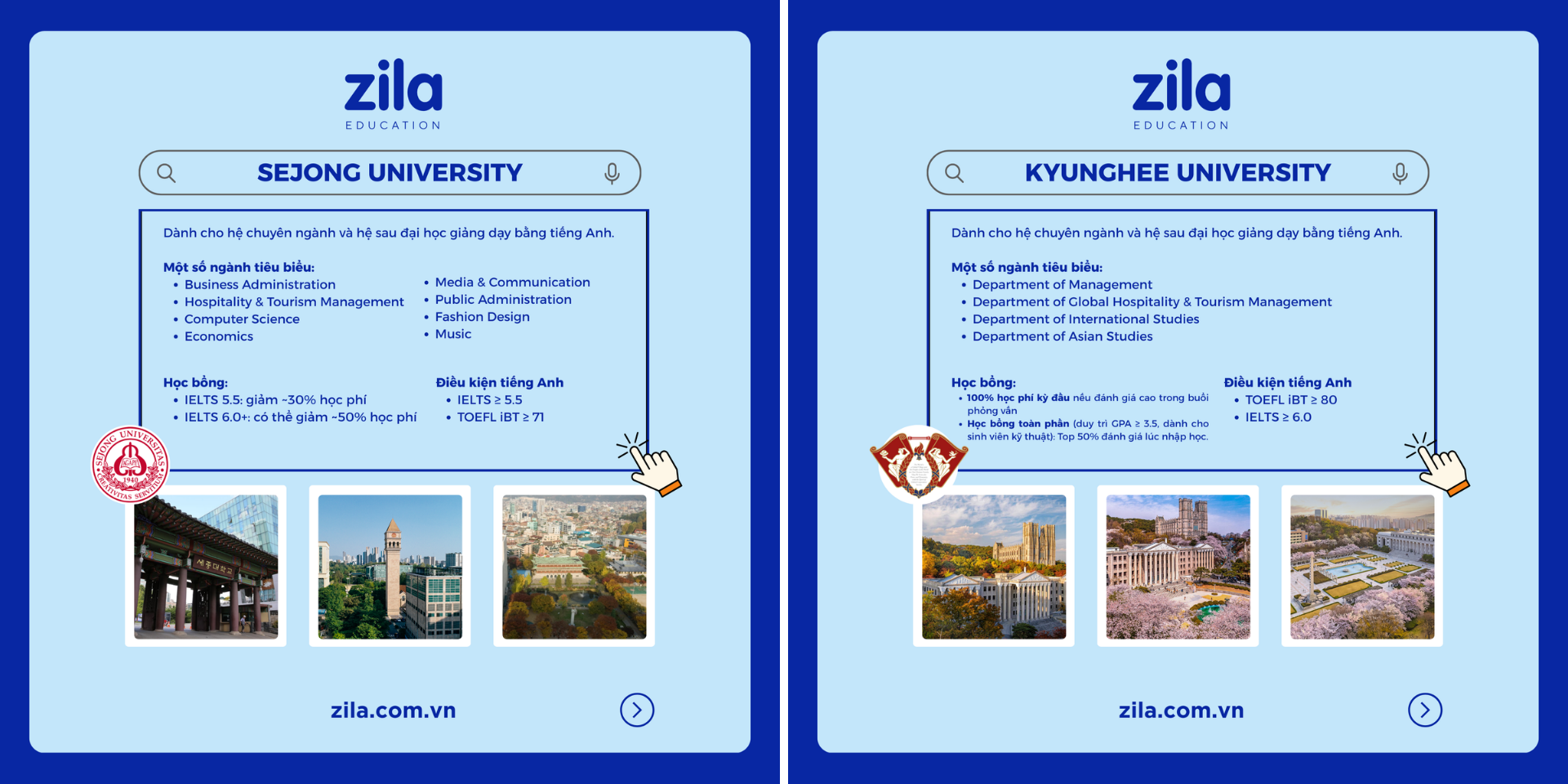 Với hơn 10 năm kinh nghiệm trong lĩnh vực du học Hàn Quốc, Zila sẽ tư vấn mọi thông tin cần thiết về du học Hàn Quốc hoàn toàn MIỄN PHÍ, giúp học sinh và gia đình lựa chọn được trường học và khu vực phù hợp để có được cái nhìn đầy đủ và chính xác nhất trước khi quyết định sang du học Hàn Quốc.