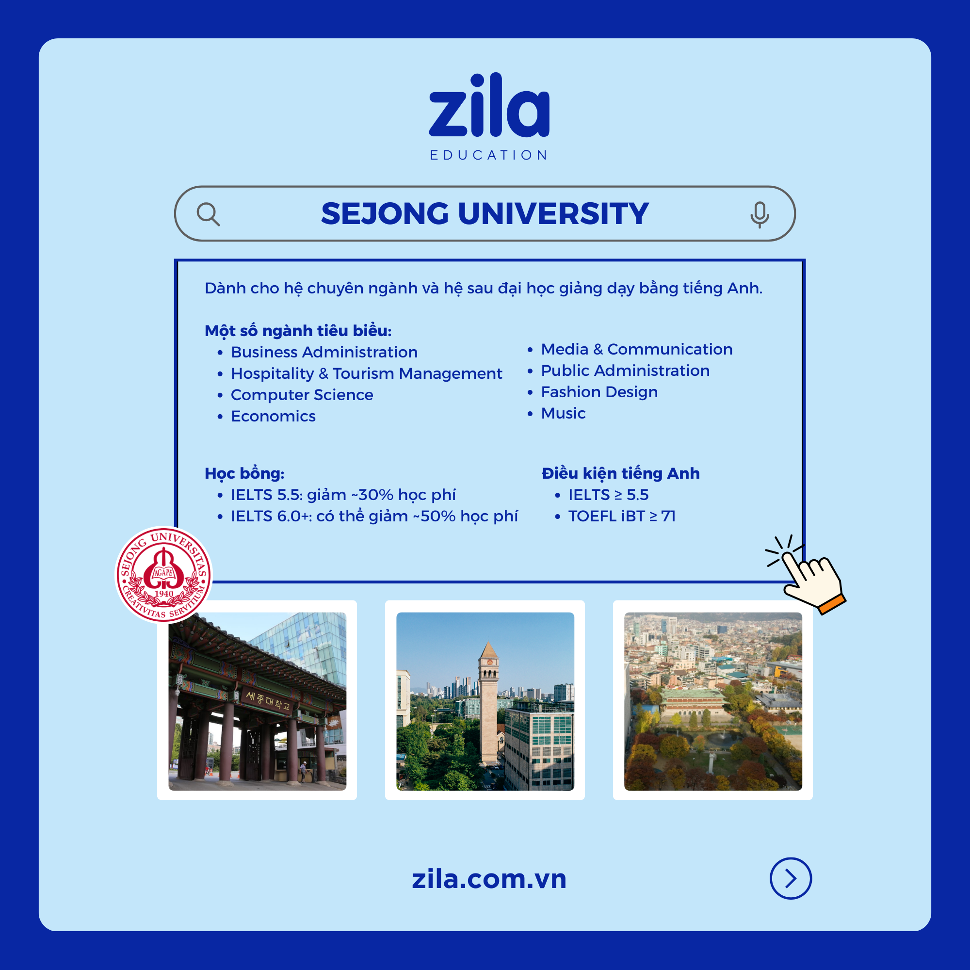 Đại học Sejong là một ngôi trường rất uy tín tại Hàn Quốc có lịch sử hơn 70 năm thành lập với chất lượng giảng dạy cao. Đặc biệt với 2 ngành nổi bật là Quản trị kinh doanh và Quản trị du lịch khách sạn bằng chương trình tiếng Anh. Đại học Sejong nổi tiếng với các suất học bổng giành cho du học sinh có thành tích học tập tốt, giá trị học bổng lên tới 100% mức học phí cho 4 năm.