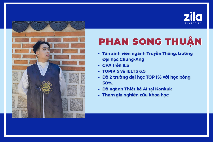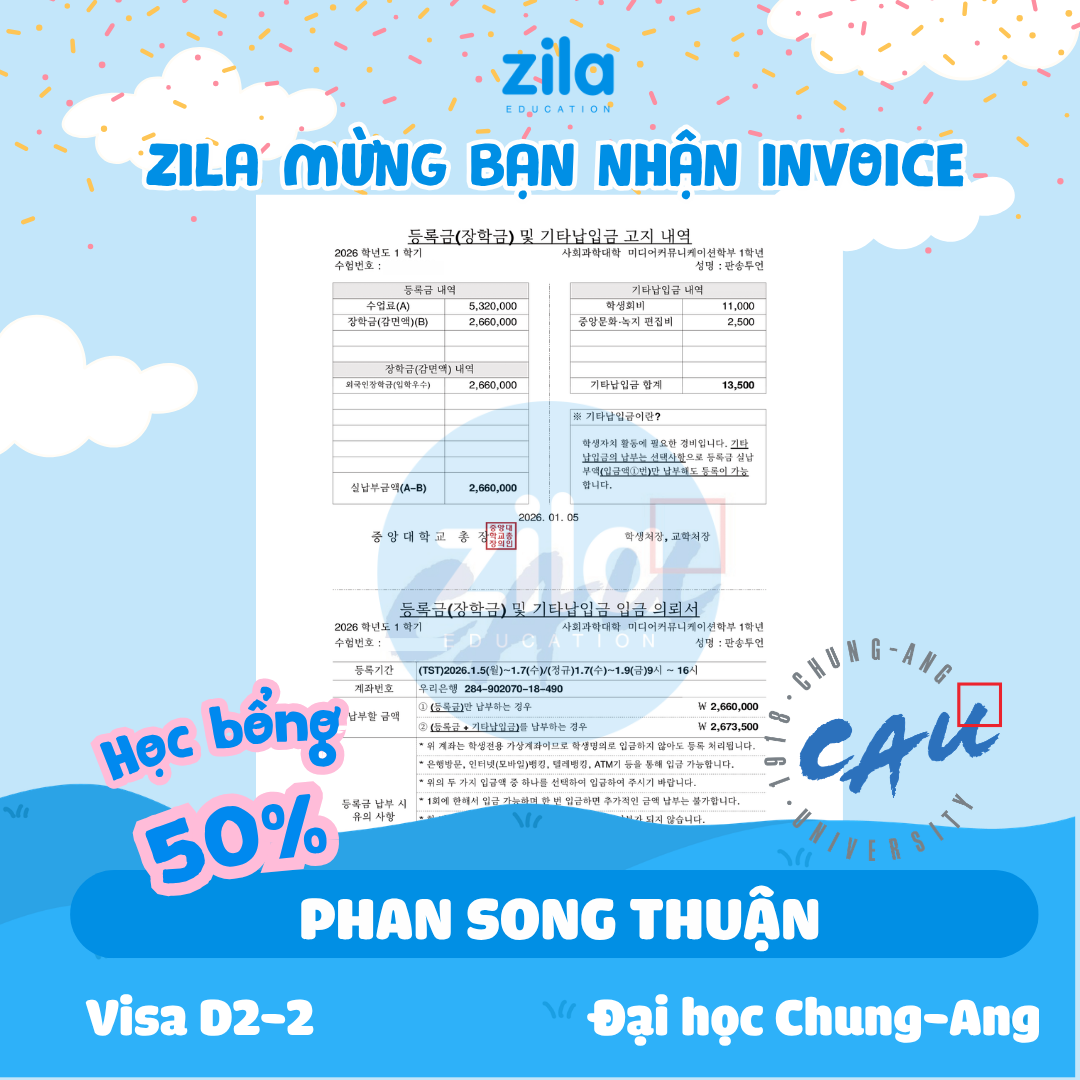 Việc nhận được học bổng học kỳ đầu tiên với mức 50% từ Chung Ang và 60% từ Konkuk là điều em đã phần nào dự đoán trước, vì trong quá trình chuẩn bị, em đã đầu tư rất nhiều cho việc học tiếng Hàn và đạt TOPIK 5 theo yêu cầu của trường, cùng với việc hoàn thiện các điều kiện khác.