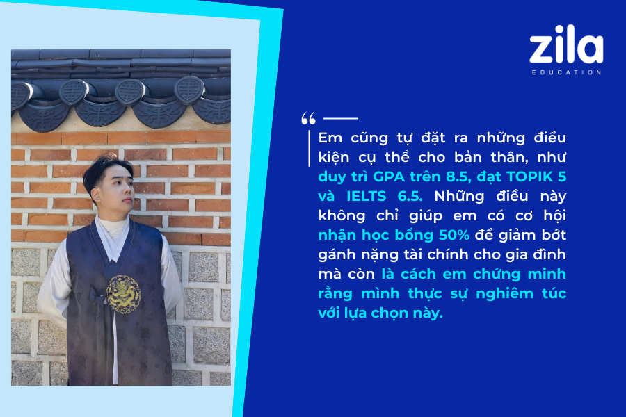Bên cạnh đó, em cũng tự đặt ra những điều kiện cụ thể cho bản thân, như duy trì GPA trên 8.5, đạt TOPIK 5 và IELTS 6.5. Những điều này không chỉ giúp em có cơ hội nhận học bổng 50% để giảm bớt gánh nặng tài chính cho gia đình mà còn là cách em chứng minh rằng mình thực sự nghiêm túc với lựa chọn này.