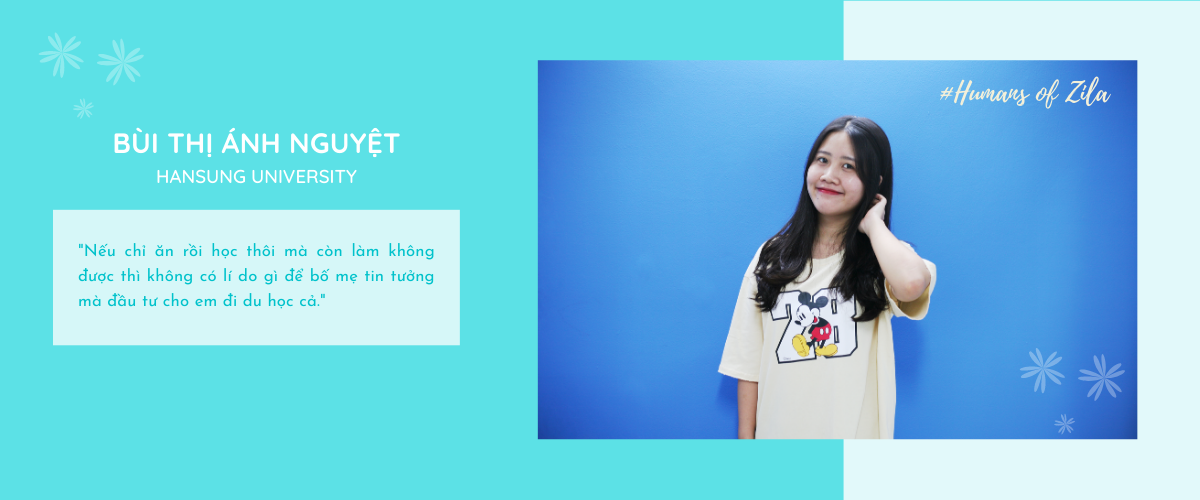 안녕하세요! Mình tên là Ánh Nguyệt. Hiện tại mình 19 tuổi. Mình sinh ra ở Bình Phước – nơi nổi tiếng với lượng điều và cao su lớn nhất. Mình vừa tốt nghiệp trường THPT Lộc Ninh vào năm ngoái (2019). Sau khi tốt nghiệp thì mình quyết định đi du học vào tháng 9 năm nay. Và mình vừa mới hoàn thành khóa học tiếng tại trung tâm du học Zila. Sắp tới mình sẽ là học viên của trường Đại học Hansung, Seoul, Hàn Quốc.