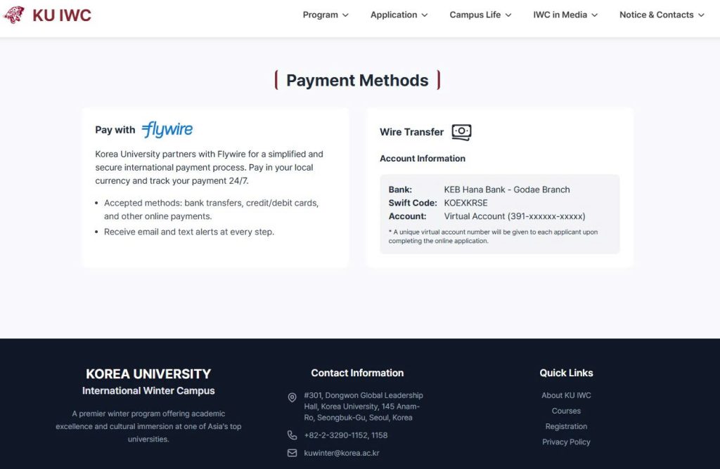 - Một số trường/chương trình chỉ cho phép thanh bằng ngoại tệ nhất định: Ví dụ Korea University Winter Campus có hỗ trợ “Flywire” cho các nước ngoài, nhưng tiền thanh toán chỉ được chấp nhận bằng ngoại tệ như USD hoặc các loại ngoại tệ được chỉ định.