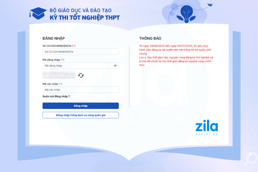 Lưu ý: Nếu là thí sinh tự do, bạn có thể đăng nhập qua Cổng Dịch vụ Công Quốc gia bằng tài khoản VNeID, quét QR hoặc nhập thông tin theo hướng dẫn.