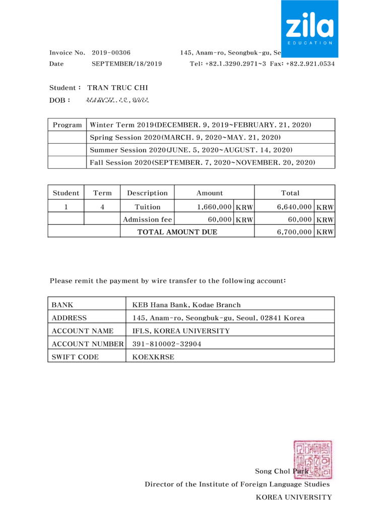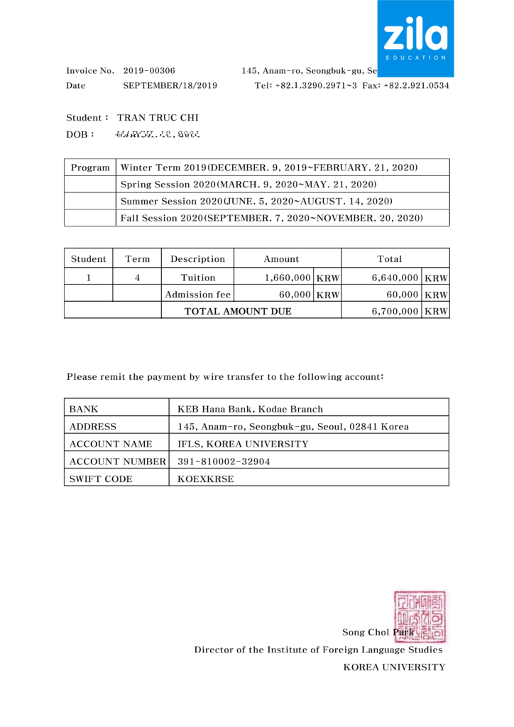 INVOICE ĐẠI HỌC KOREA