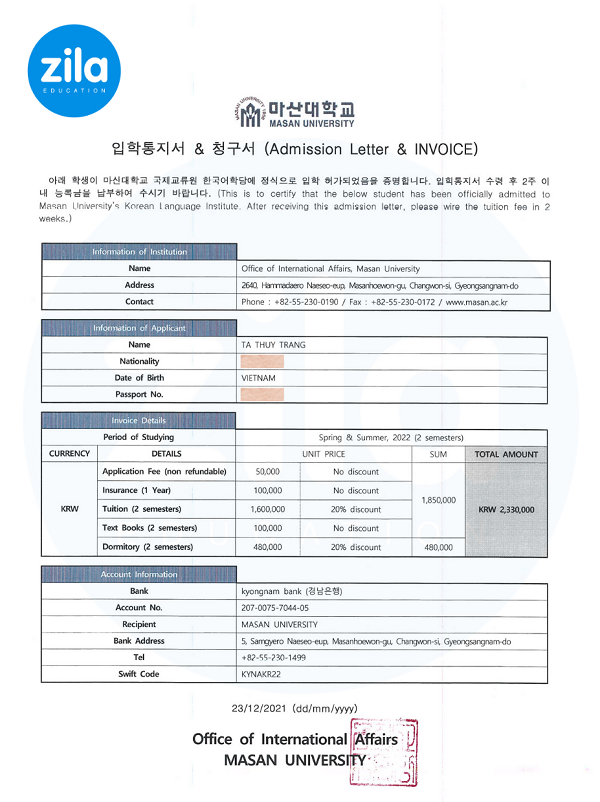INVOICE KHÓA TIẾNG HÀN – TRƯỜNG ĐẠI HỌC MASAN