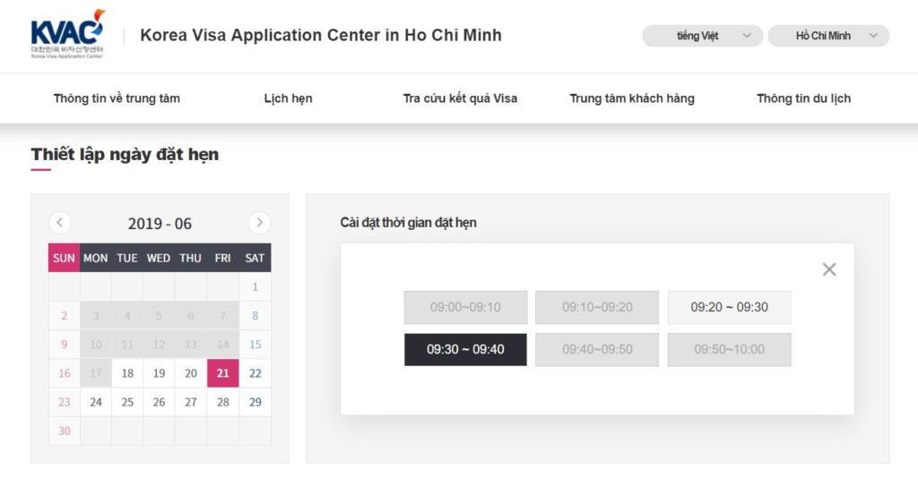 - Bước 1: Truy cập vào website của Trung tâm tiếp nhận visa Hàn Quốc tại TP Hồ Chí Minh (tại đây)