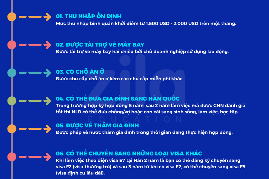 Khi sở hữu visa E-7 (lao động chuyên môn), bạn không chỉ được làm việc hợp pháp tại Hàn Quốc mà còn được hưởng nhiều quyền lợi hấp dẫn và cơ hội phát triển lâu dài: