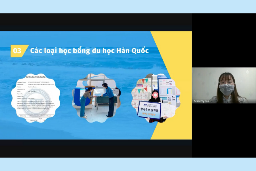 Học bổng luôn là một yếu tố được rất nhiều du học sinh quan tâm khi tìm hiểu về du học cũng như trong quá trình theo học. Đây không chỉ là món quà của việc nỗ lực học tập mà còn giúp DHS trang trải chi phí du học. Và chúng ta có thể nhận rõ sự mở rộng vượt bậc của du học Hàn Quốc những năm gần đây. Kéo theo đó là số lượng DHS ngày càng nhiều và nhu cầu săn học bổng tăng cao. Hiểu được điều đó, Zila đã tổ chức sự kiện Webinar với chủ đề “Bí quyết săn học bổng Du học Hàn Quốc” vào ngày 2/4 vừa qua. Sự kiện đã diễn ra với sự tham gia của hơn 30 người tham dự quan tâm đến du học Hàn Quốc.
