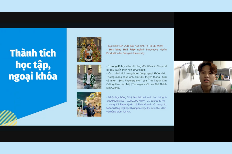 Sau phần “Giới thiệu” là phần “Trò chuyện cùng khách mời Phùng Minh Huy”. Hiện anh chàng đang theo học khoa Quản trị kinh doanh, trường Đại học Kyunghee với bảng thành tích đáng nể: