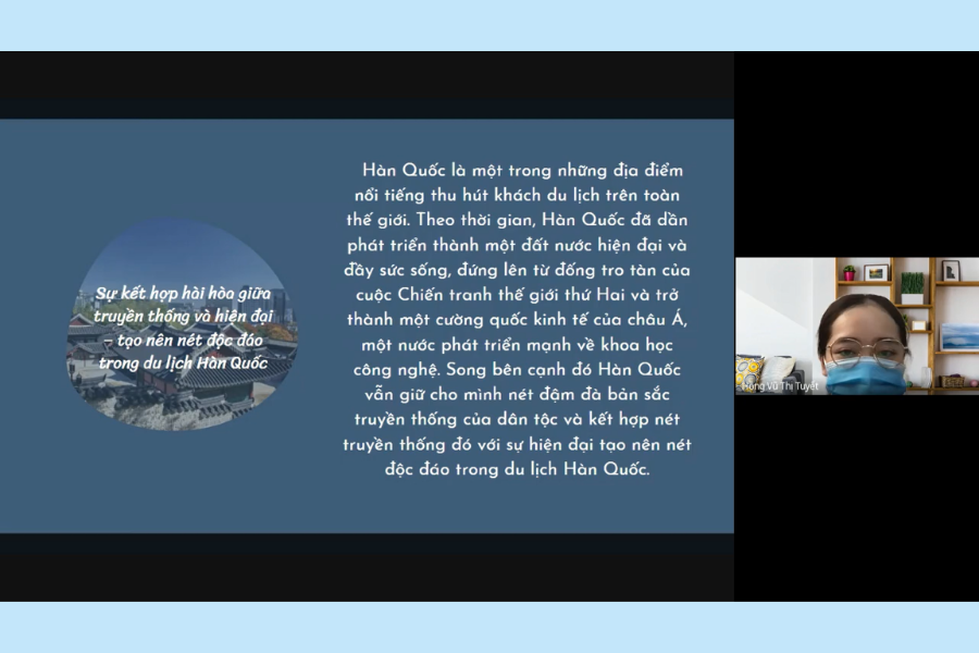 Sau “Đặc điểm tự nhiên” là phần “Sự kết hợp hài hòa giữa truyền thống và hiện đại”. Ở đầu nội dung này, chị Tuyết Hồng dẫn dắt các bạn đến với các cung điện lớn, làng cổ và lễ hội truyền thống của Hàn Quốc. Dù đã dần phát triển thành một đất nước hiện đại nhưng Hàn Quốc vẫn giữ cho mình sự đậm đà bản sắc dân tộc. Đồng thời, quốc gia này thành công kết hợp nét đẹp truyền thống với hiện đại trong nền kinh tế du lịch.